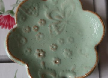 Pottenbakken – Zeegroen rond schaaltje met strikje en bloemetjes