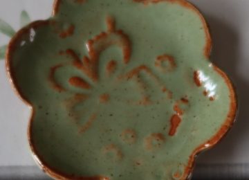 Pottenbakken – Iets kleiner zeegroen met oker accenten bloemvormig schaaltje
