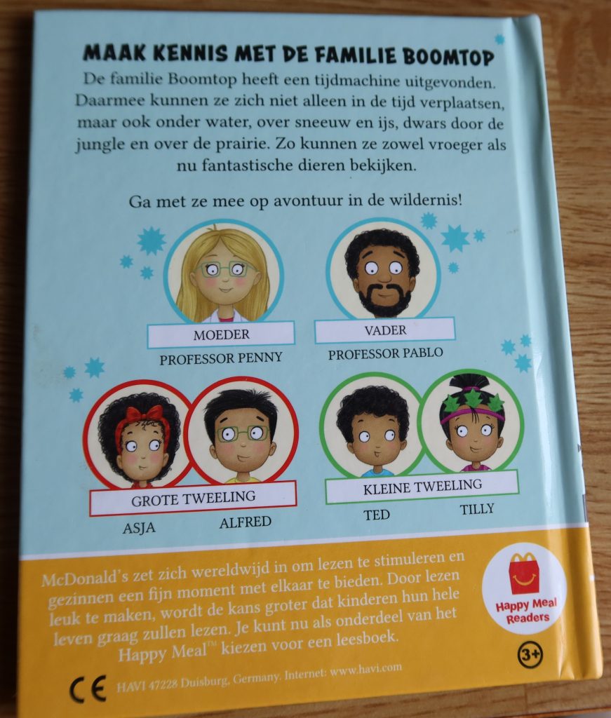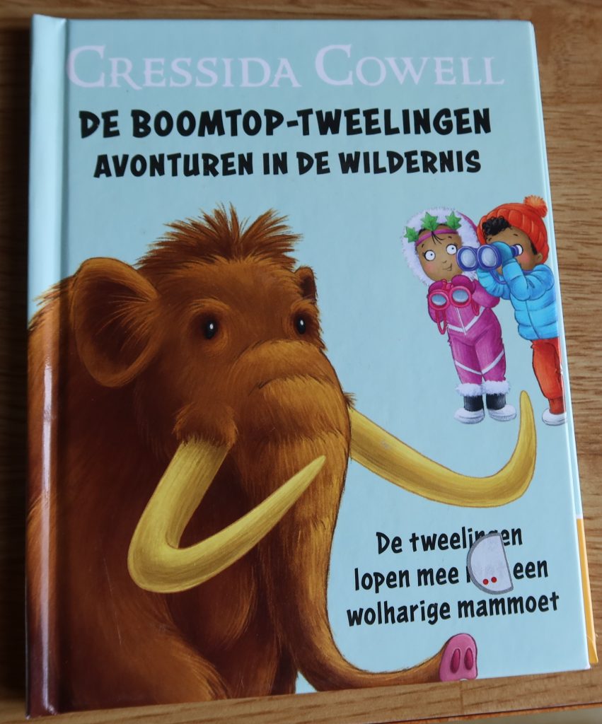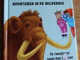 De tweelingen lopem mee met een wolharige mammoet